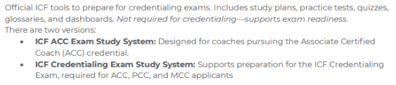 DISCLAIMER: It is important to note that the study systems referenced were developed independently from ICF Credentials and Standards. This separation ensures the integrity and validity of the exam. This product is developed by ICF Learning and Development, which operates independently from ICF Credentials and Standards. The Learning and Development team does not have access to the content of the credentialing exams—just like any other external provider. No single study aid or resource can guarantee a passing score.
